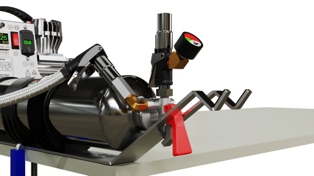 Portable high-pressure air tank for beading tires, quick refills, and compressed air wherever you need it.